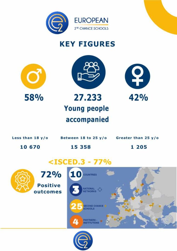 Our European network brings together 25 Second Chance Schools, 3 national networks and 4 partner institutions, supporting more than 28,000 young people each year. Among them, 59% are under 18, 41% are between 18 and 25, and the majority have a qualification level below ISCED 3. Active across 10 countries, the network achieves strong positive outcomes thanks to a shared commitment to inclusion, education and professional integration.